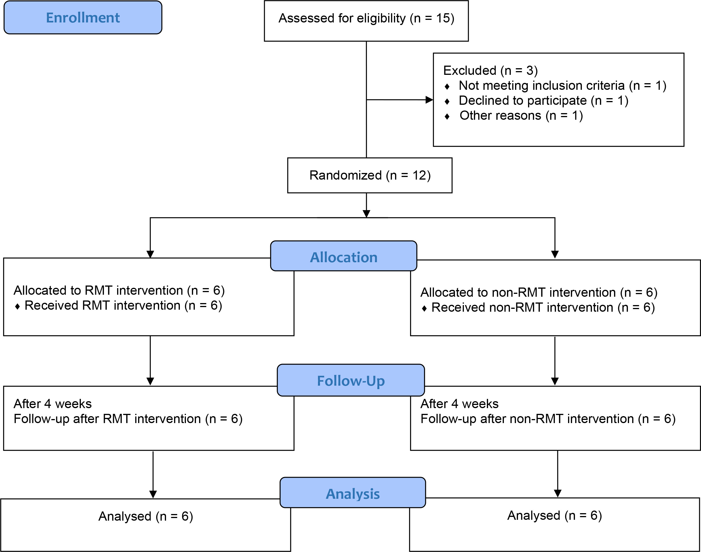 The participant recruitment, allocation, follow-up and analysis stages are presented in a CONSORT flow chart (Figure 1). The athletes were recruited from wheelchair sports training centres associated with Lovely Professional University and from institutions linked to national wheelchair sports federations in Punjab, India. Recruitment was facilitated through professional networks that distributed study invitations and information sheets to competitive wheelchair athletes. Eligible participants were athletes, aged between 25 and 42 years, diagnosed with SCI below the T1 neurological level, engaged in organized wheelchair sports (basketball, rugby, or racing) for at least one year, participating in regular, structured training within recognized sports settings. The athletes were excluded if they had experienced recent cardiorespiratory complications, progressive neurological conditions, history of poor compliance with rehabilitation programs or contraindications to RMT.