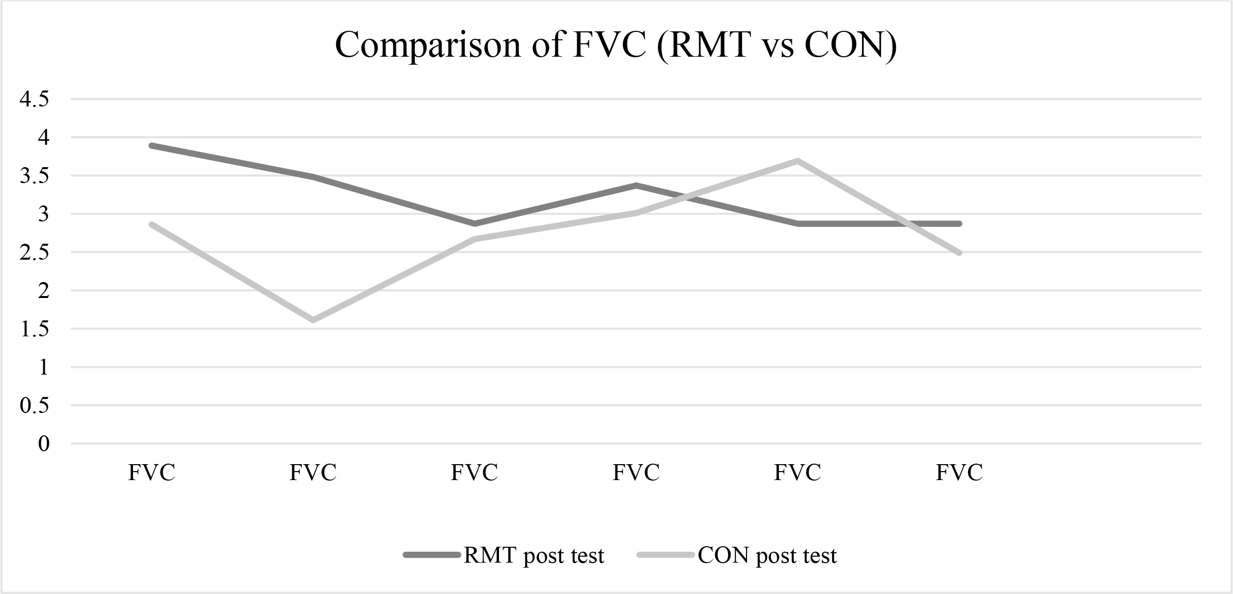 FVC: comparison between RMT and Control groups post-intervention (dark colour – RMT group, and light colour – control group)