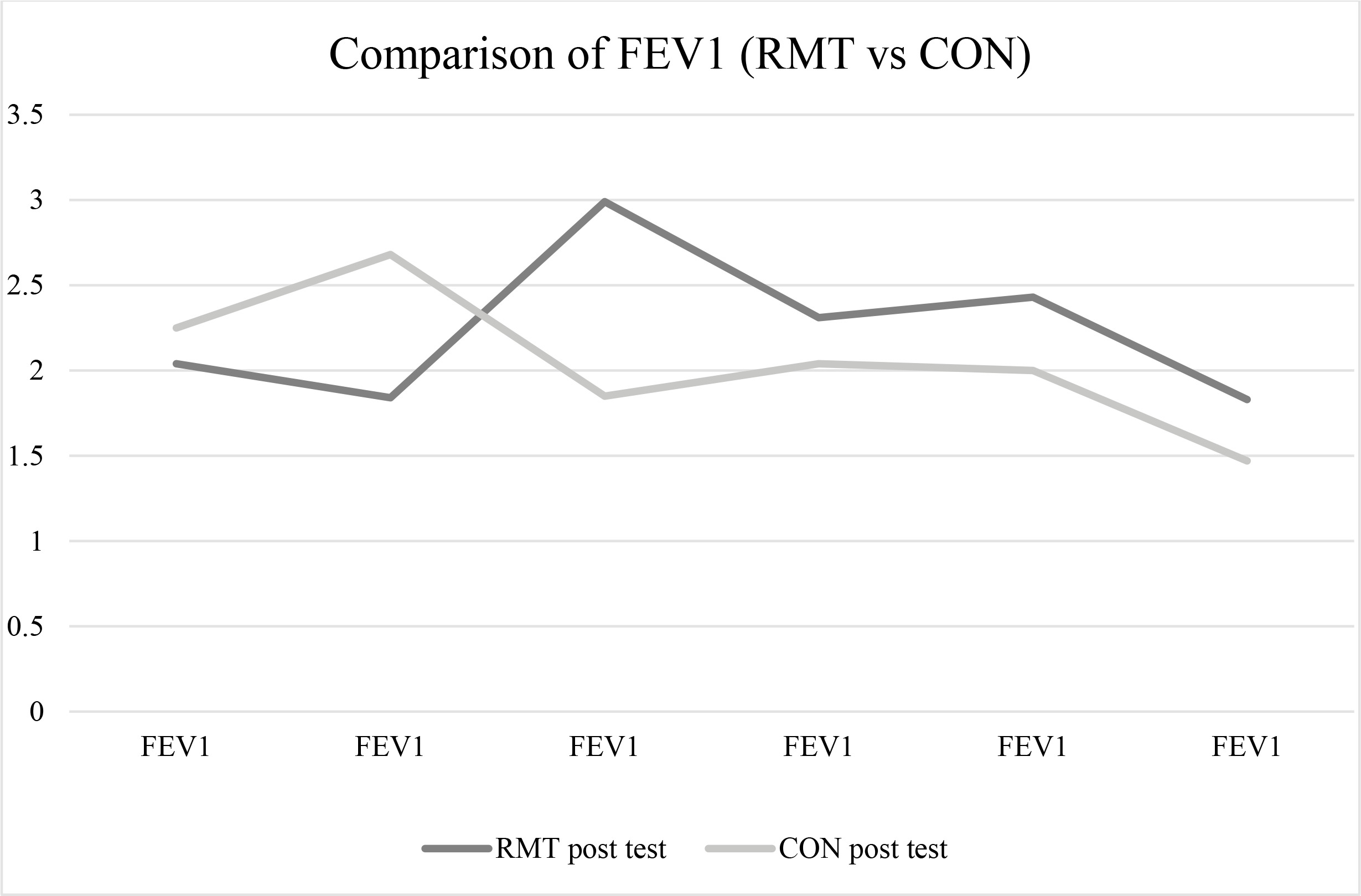 FEV1: comparison between RMT and Control groups post-intervention (dark colour – RMT group, and light colour – control group)