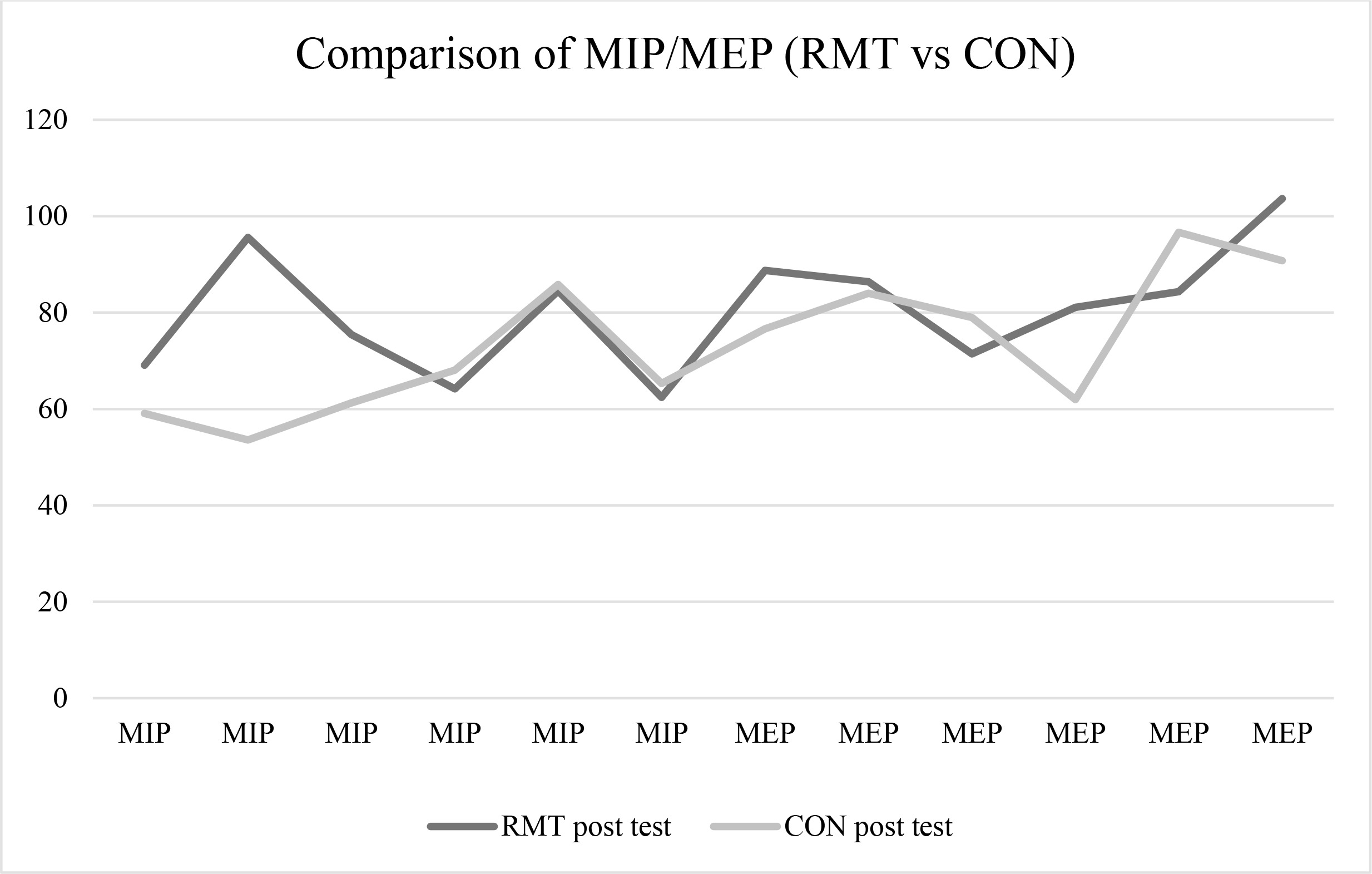 MIP/MEP: comparison between RMT and Control groups post-intervention (dark colour – RMT group, and light colour – control group)