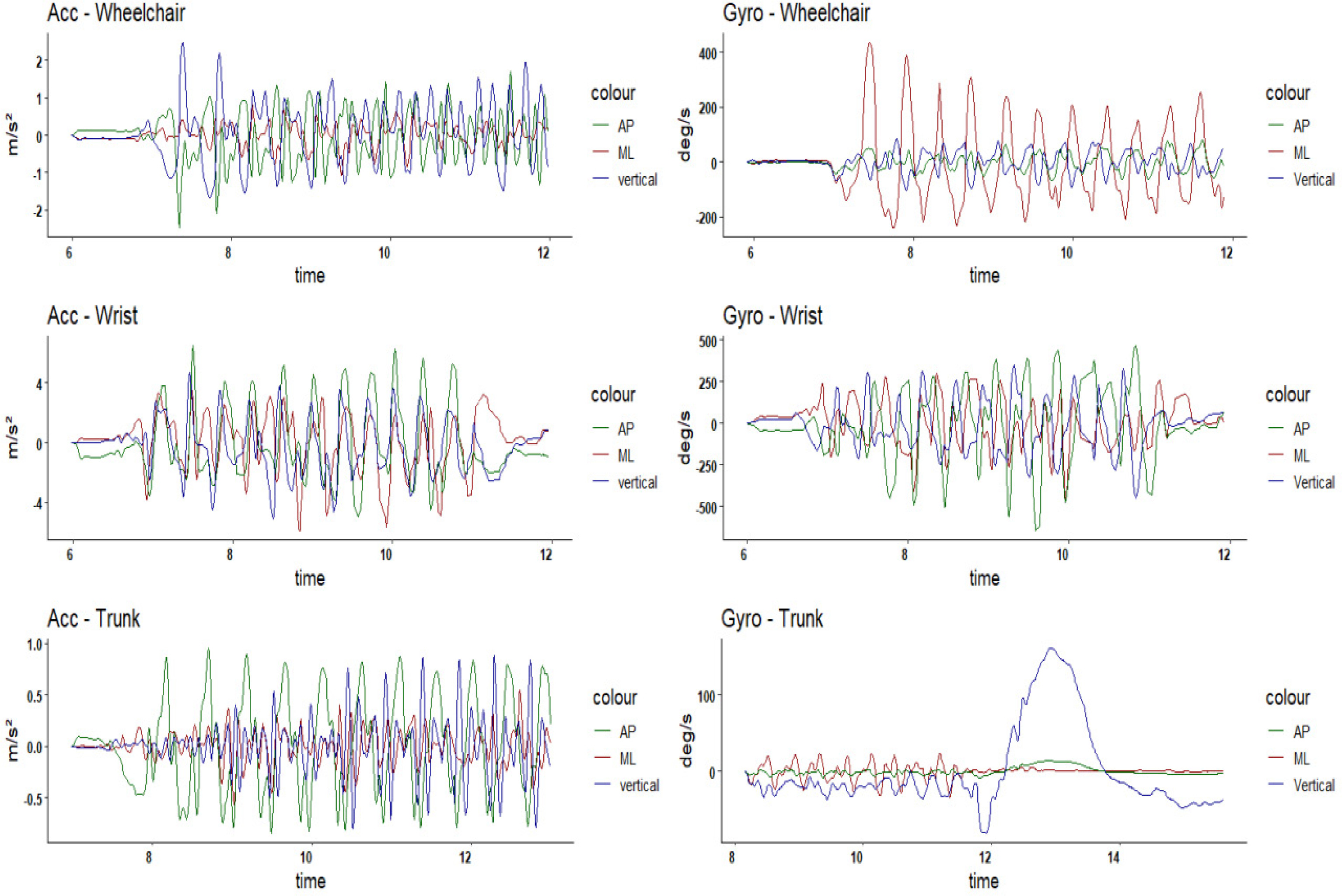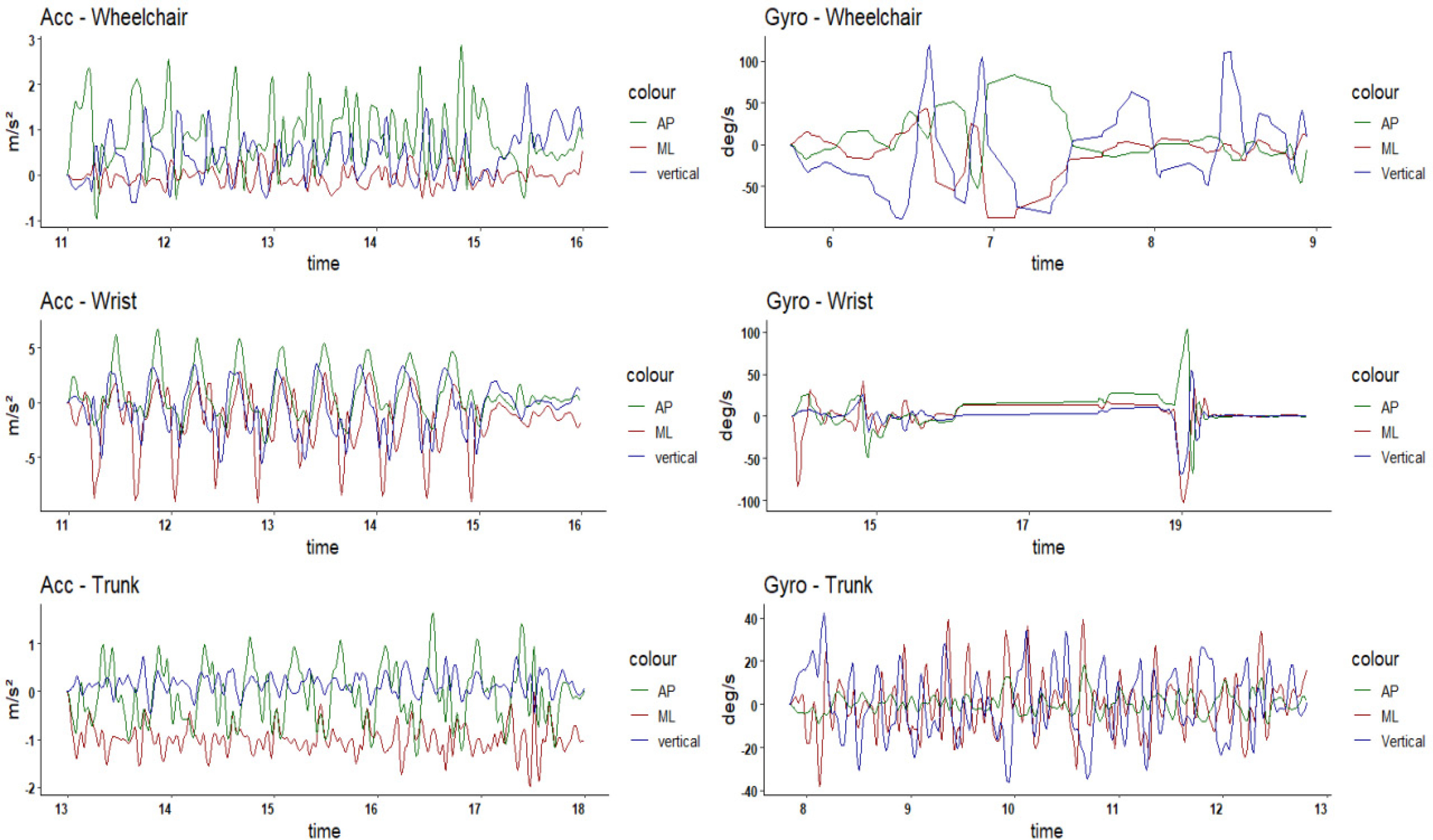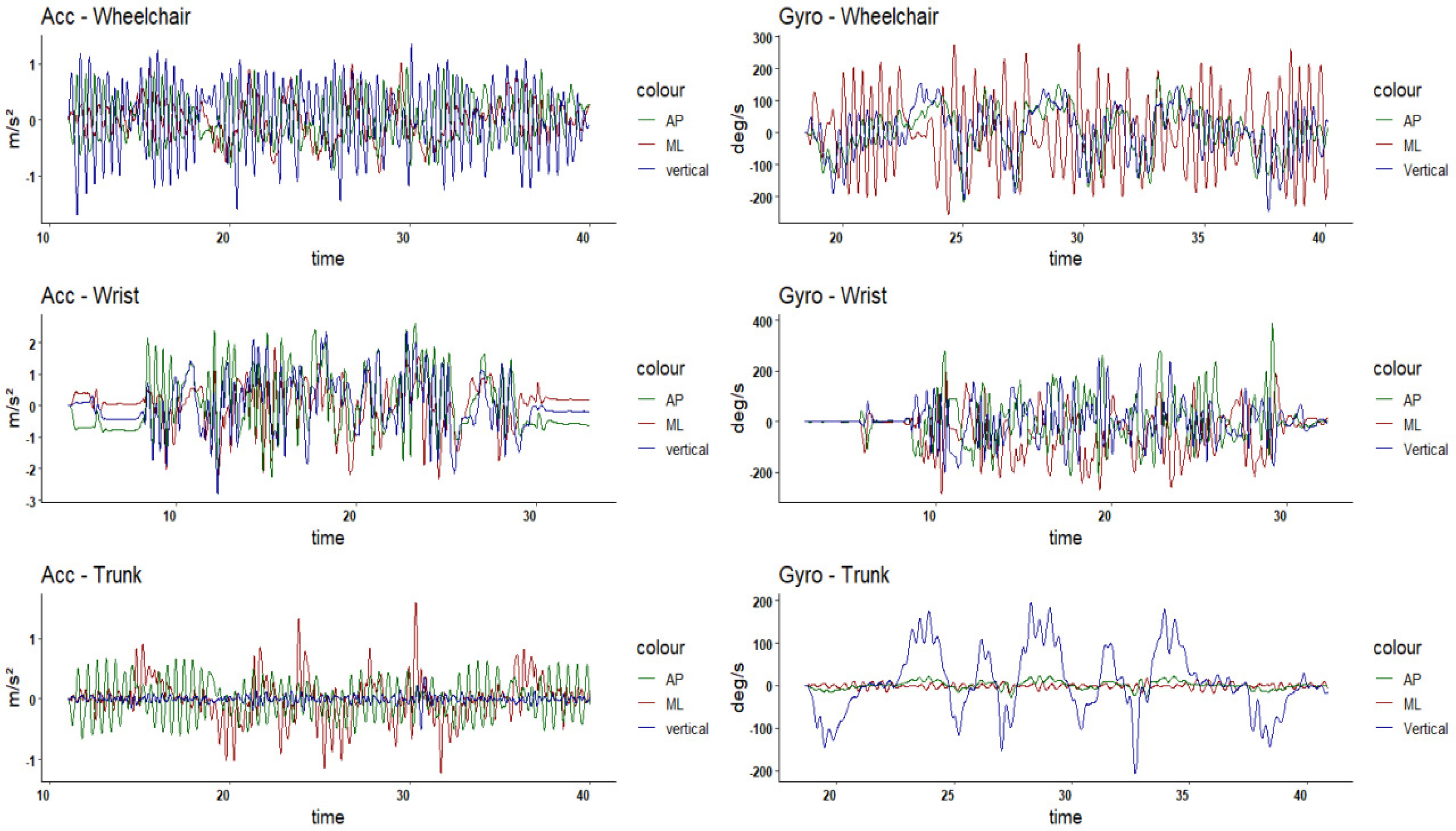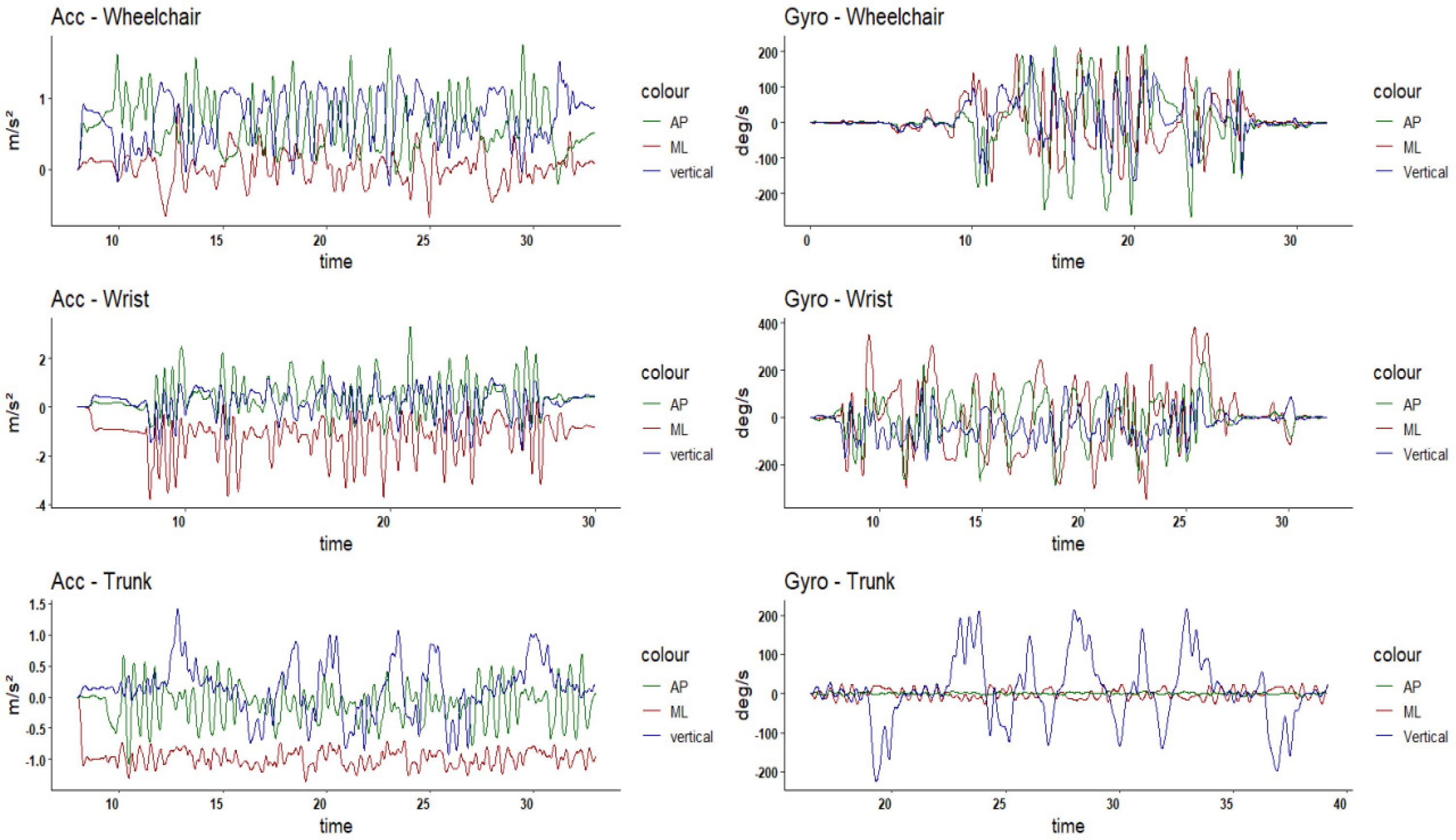 In wheelchair basketball, a few studies have explored the use of IMUs to support the process of classification. These studies used three IMUs positioned on the wheelchair (one on each rear wheel axis and another on the rear frame bar), and analyzed variables like acceleration and velocity in relation to athlete sport class7,12,13. Although these studies provide initial evidence that mobility metrics may correlate with classification in wheelchair basketball, their sensor positioning was limited exclusively to the wheelchair frame: none have explored the positioning of the sensors on the trunk of the athlete, despite trunk position being a key factor in classification in wheelchair basketball.
