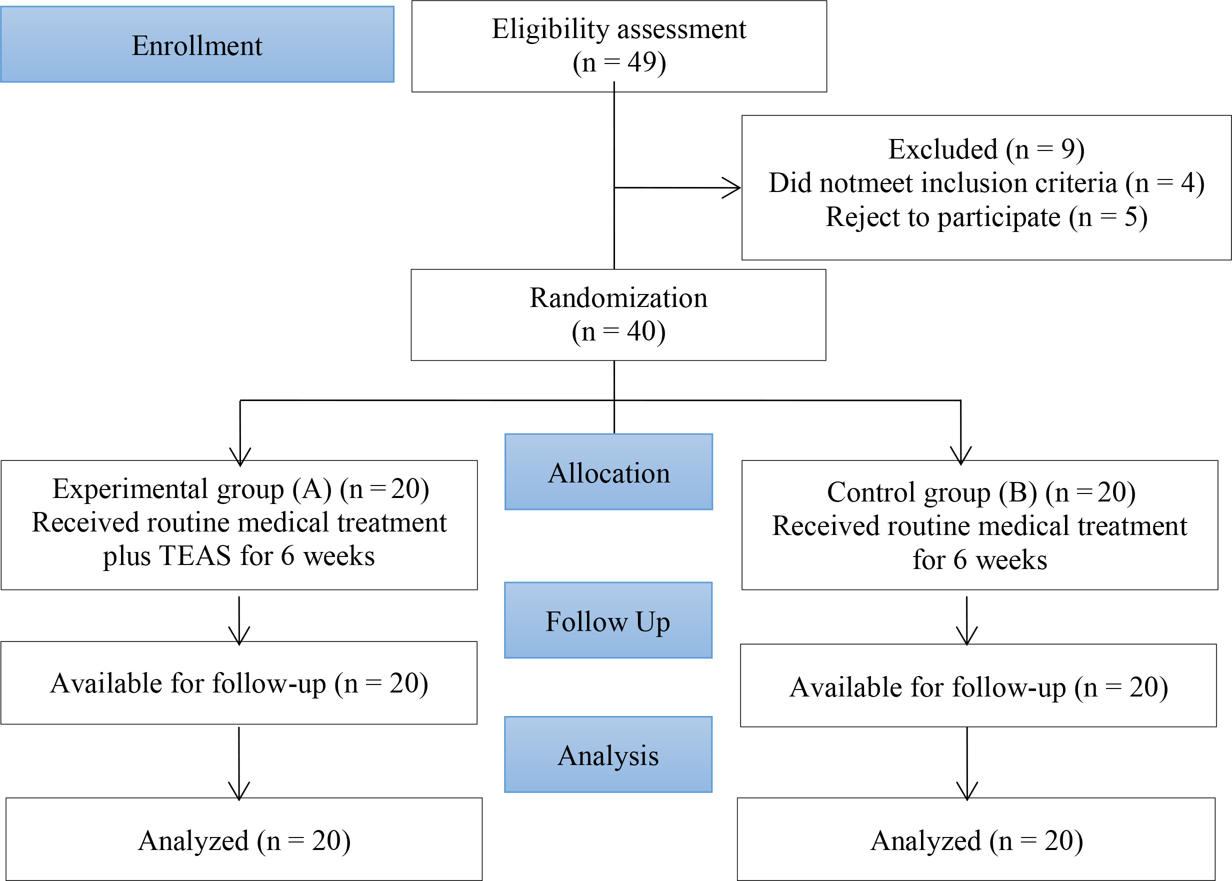 The participants were randomly distributed into two equal groups (n = 20). The study group (A) received transcutaneous electrical acupoint stimulation (TEAS) plus routine medical therapy, whereas the control group (B) underwent routine medical therapy only. The TEAS program was applied for 40 minutes per treatment session, three times weekly for six consecutive weeks.