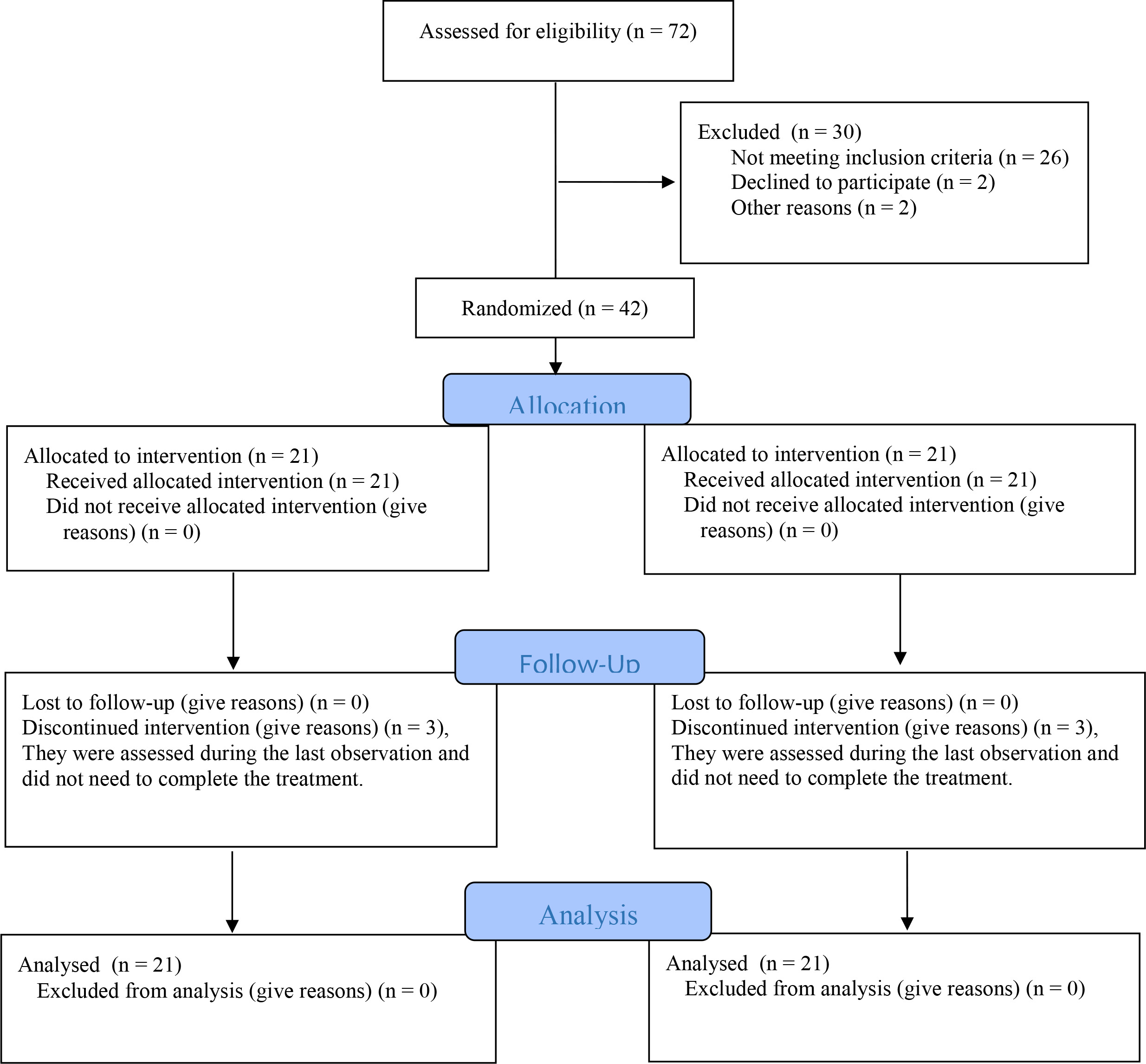 Sample size was estimated using G*POWER software (version 3.1.9.4), the calculation used t-tests for Wilcoxon-Mann-Whitney test (two groups) was applied, with α = 0.05, Power = 0.95, Allocation ratio = 1, and effect size d = 1.79. The results indicated a minimum sample size of 20; therefore, assuming a dropout rate of 20%, 24 participants should be recruited. This effect size was calculated from a pilot study on 20 participants (10 in each group), with DCFE as the primary outcome. However, the actual sample size used was 42, consisting of 21 participants in Group A and 21 participants in Group B.