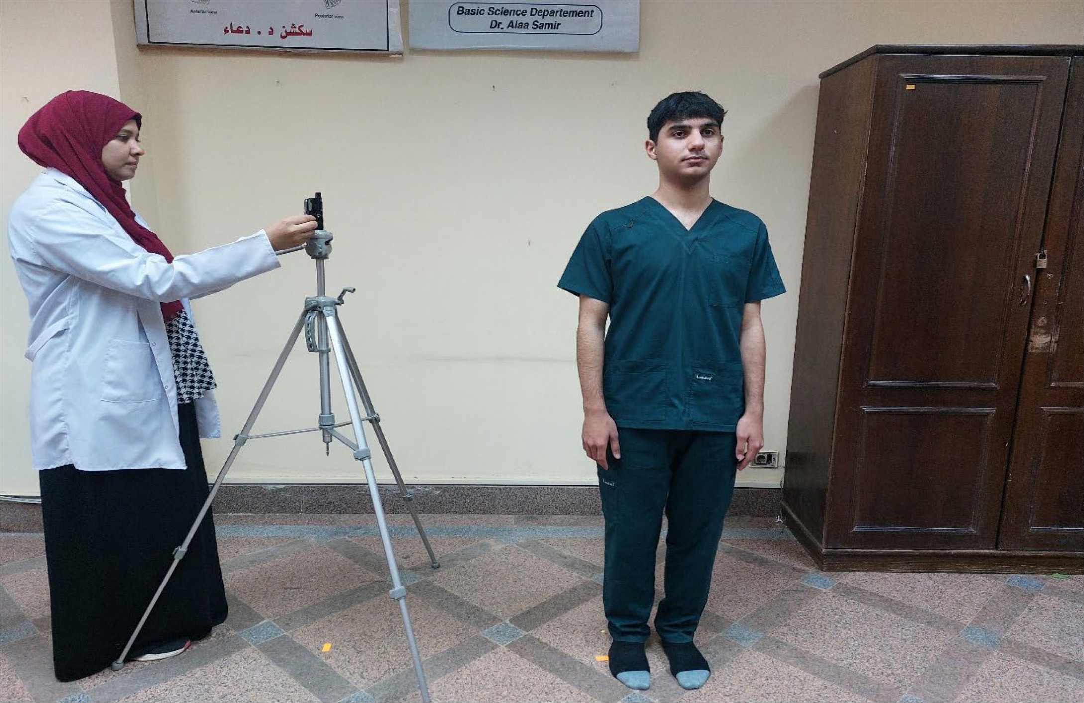 The study included 42 participants, aged between 18 and 40, of both sexes, with symptomatic FHP < 50°7 (Figure 1). All were recruited through word-of-mouth, i.e. oral requests to participate from the colleges and staff of the Faculty of Physical Therapy, Cairo University. Participants were not involved if they had previous neck injuries, neck and shoulder surgery, shoulder trauma, tendinitis, or thoracic surgery7. All participants provided their informed consent before taking part.