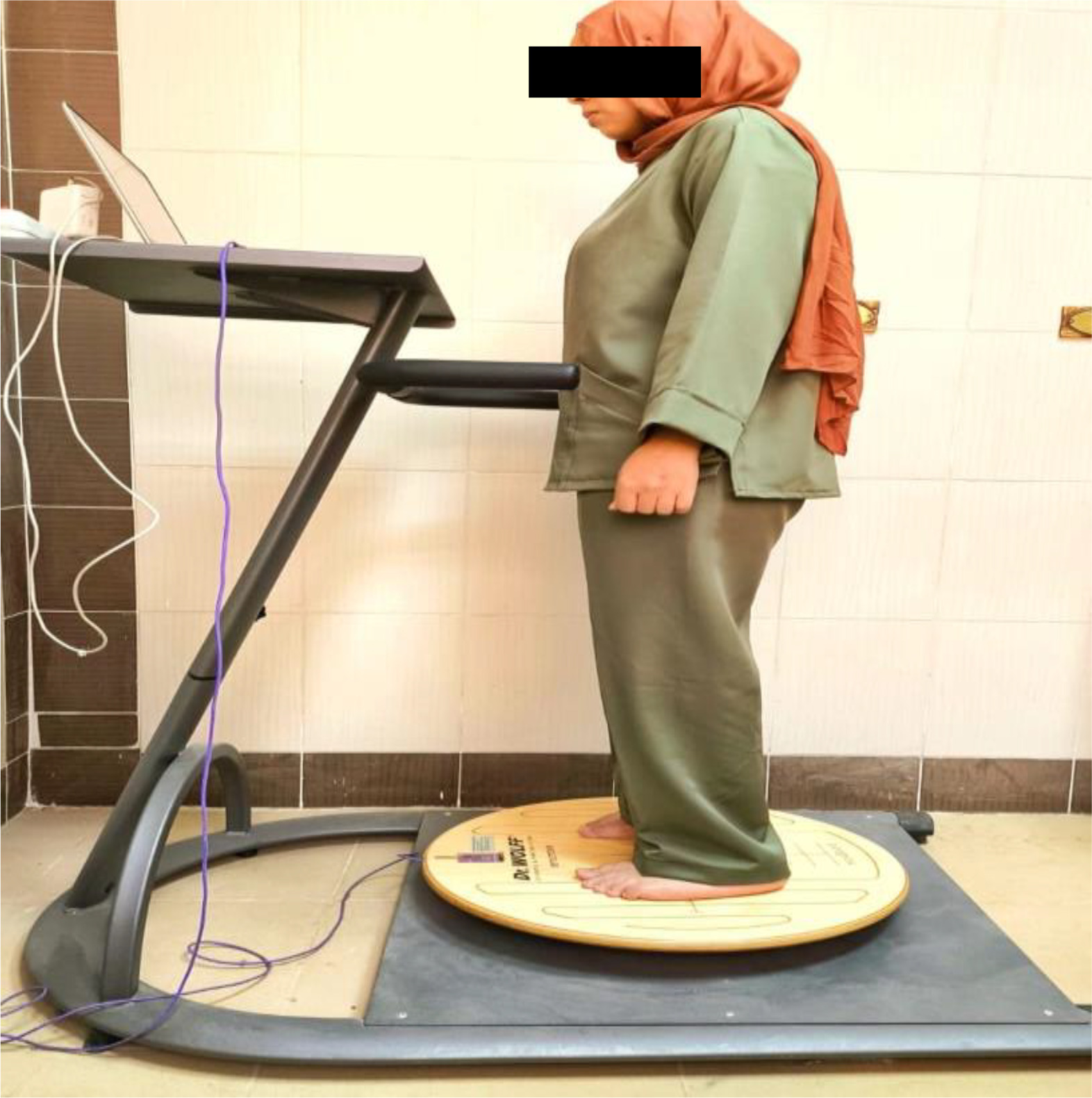 A total of 44 university students (10 men and 34 women) were recruited from the Kafr Elsheikh University Faculty of Physical Therapy. All participants had a bilaterally pronated foot posture and were aged between 18 and 21 years12; body mass index (BMI) ranged from 18.5 to 2513. The following exclusion criteria were applied: recurrent lower extremity injuries, including fractures or deformities, or a history of surgical intervention in the lower extremities; any neurological deficit affecting balance; any medication that can affect balance; pregnant and breastfeeding women; and participants with unilateral flexible flatfoot14.