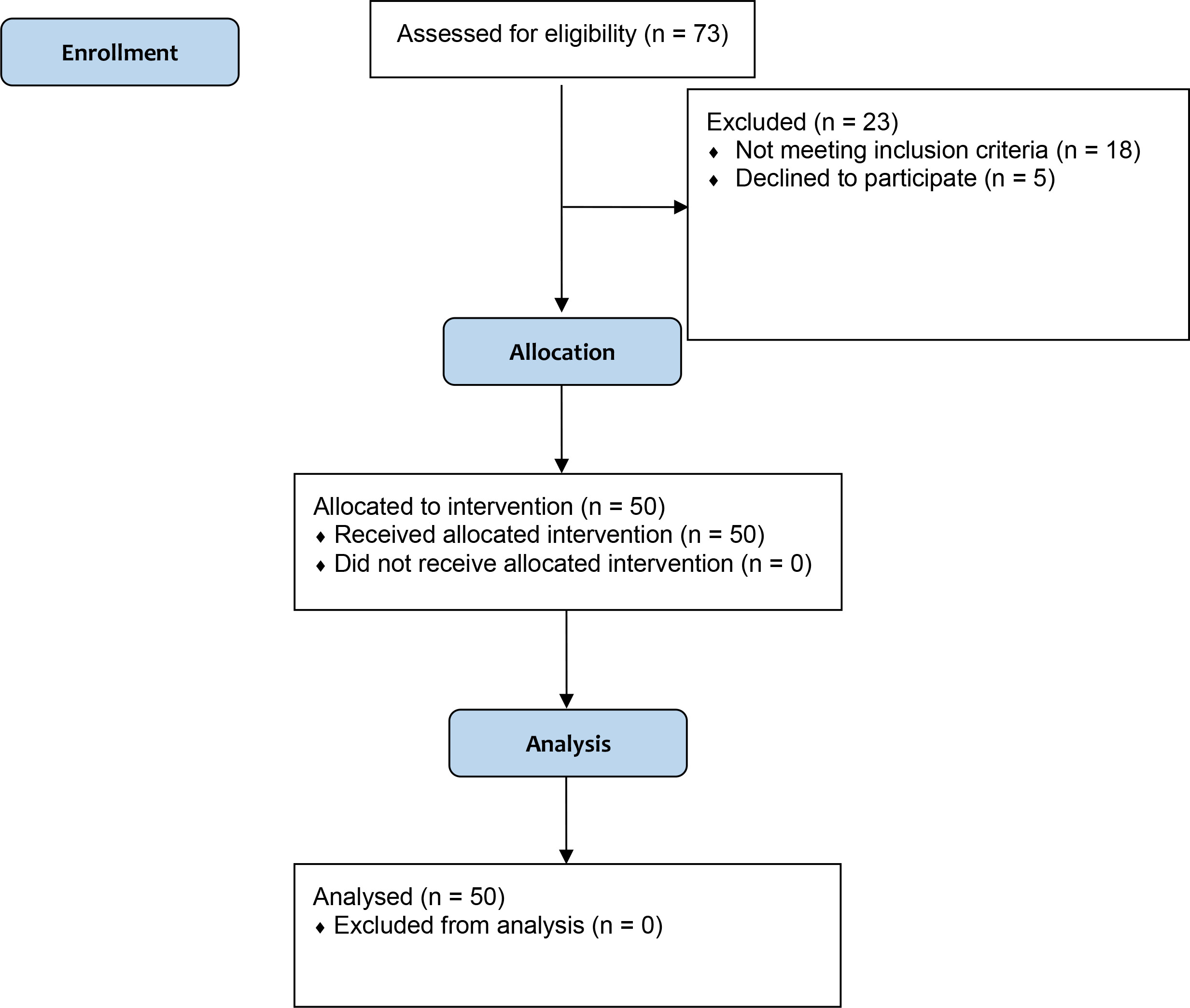 The study group included 50 patients, 37 of whom were men (74%), with no dropouts (Figure 2). The mean age was 55.76 ± 13.19 years. The demographic and clinical characteristics of the group are given in Table 1.